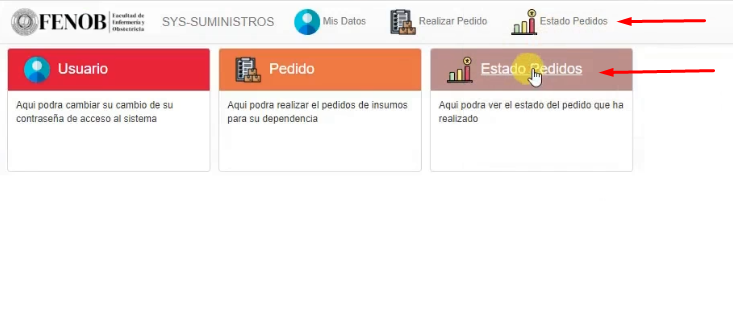 3. Una vez que ingresa al sistema de suministro seleccione el link o botón Estado Pedidos , usted verá en este apartado su pedido si ya fue aprobado por el Jefe de su dependencia. Si no ve aquí su pedido es porque el jefe de su dependencia debe aprobarlo primero.