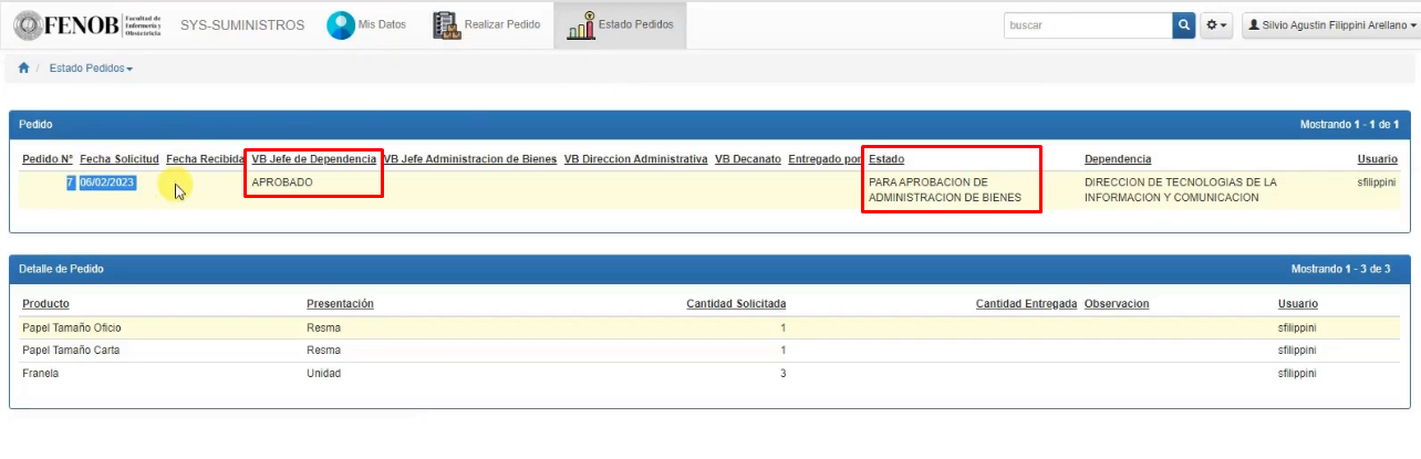 4. Una vez que se visualiza su pedido en Estado Pedidos puede hacer el seguimiento correspondiente y verificar en que instancia se encuentra.